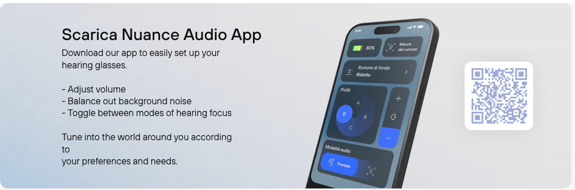 Per configurare i Nuance Audio™ Glasses sono necessari un indirizzo e-mail e un telefono cellulare sul quale utilizzare la Nuance Audio™ App (download gratuito, il QR code per il download è stampato all’interno della confezione). Potrebbe essere necessario installare occasionalmente aggiornamenti, anche prima del primo utilizzo. Per ulteriori informazioni, scansionare il QR code sull’ultima pagina della guida per l’utente.